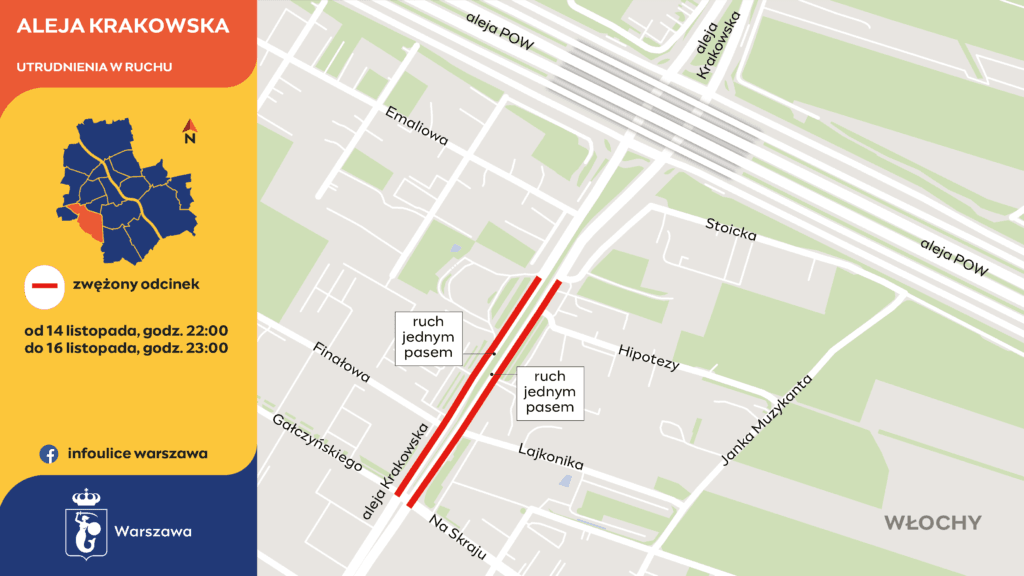 W najbliższy weekend drogowcy wymienią nawierzchnię w dwóch ważnych miejscach stolicy – al. Waszyngtona na Pradze-Południe oraz al. Krakowskiej we Włochach. Prace rozpoczną się wieczorem 14 listopada i potrwają do poniedziałkowego poranka, 17 listopada. Oznacza to utrudnienia i zmiany w komunikacji miejskiej.