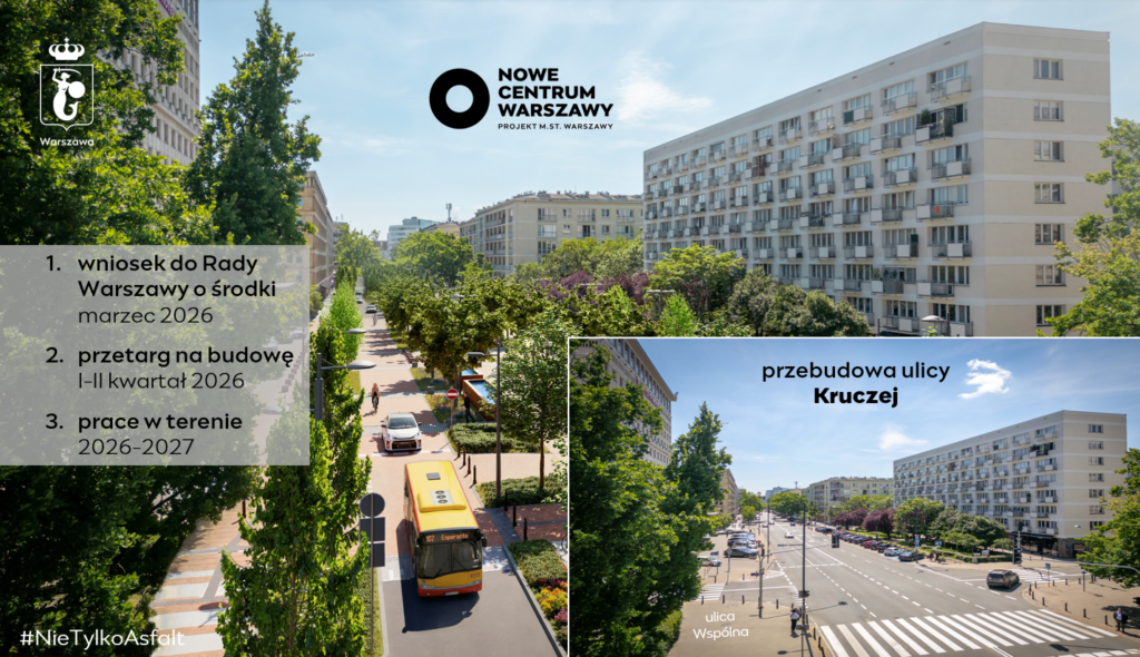 Zarząd Dróg Miejskich, Stołeczny Zarząd Rozbudowy Miasta oraz Tramwaje Warszawskie zaprezentowali plan remontów na najbliższe miesiące. Jednym z większych przedsięwzięć planowanych w tym roku jest przebudowa ulicy Kruczej. W marcu wpłynie wniosek do Rady Warszawy o środki na tę inwestycję. Do końca II kwartału ogłoszony zostanie przetarg na budowę a na lata 2026-2027 zaplanowane są prace w terenie.