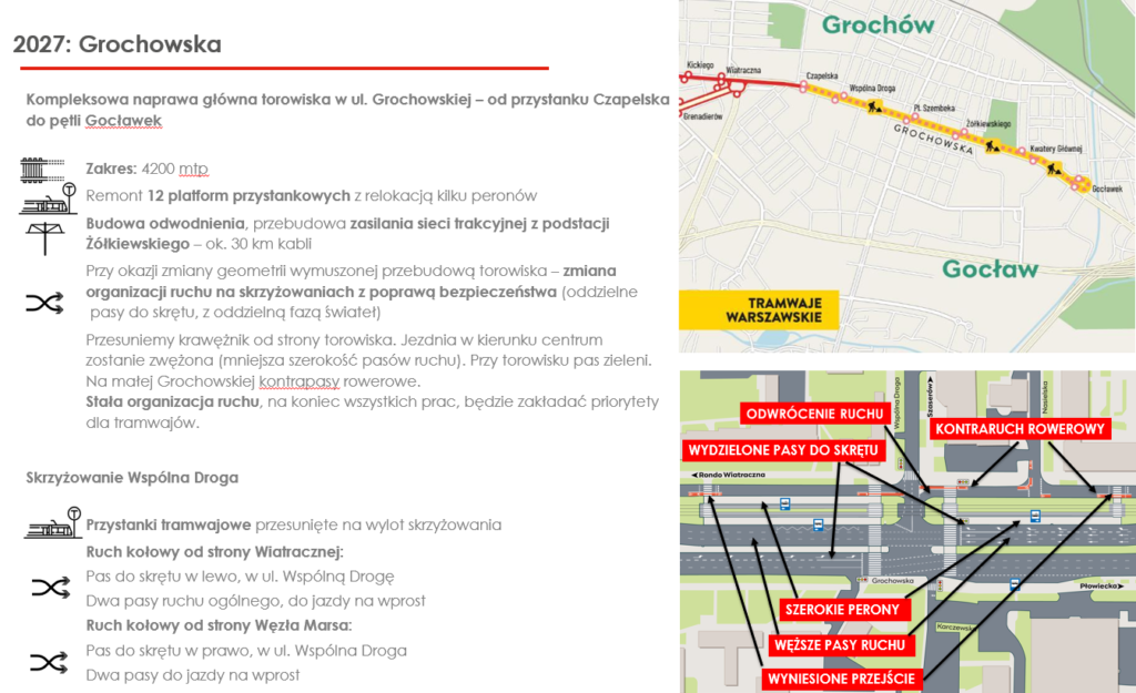 Ważne prace odbędą się ponadto na newralgicznej od lat ul. Grochowskiej. Tramwajarze zapowiedzieli już wielką przebudowę w tym miejscu, która obejmie m.in. remont 12 platform przystankowych, czy zmianę organizacji ruchu na skrzyżowaniach (oddzielne pasy do skręty i oddzielna faza świateł). Całość obejmie ponad cztery kilometry torowiska.