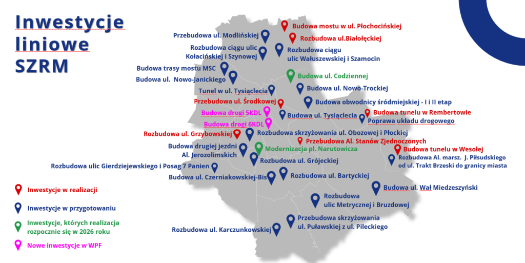 Stołeczny Zarząd Rozbudowy Miasta poinformował o łącznie 28 przygotowywanych inwestycjach, z czego siedem jest już realizowanych w terenie, a cztery w 2026 roku zostaną ukończone. Chodzi o most w ciągu ul. Płochocińskiej, wiaduktach drogowych nad ul. Paryską, czy przebudowę ul. Środkowej na Pradze-Północ.