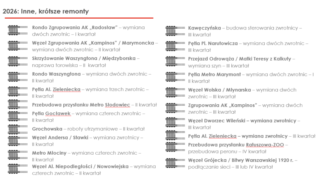 Remonty torowisk obejmą ponadto odcinki na ul. Puławskiej, Grójeckiej, ciągu Wolska do Al. Solidarności, od Kercelaka do Żelaznej, od Feminy do Pl. Bankowego, a także ciąg Al. Jerozolimskich.