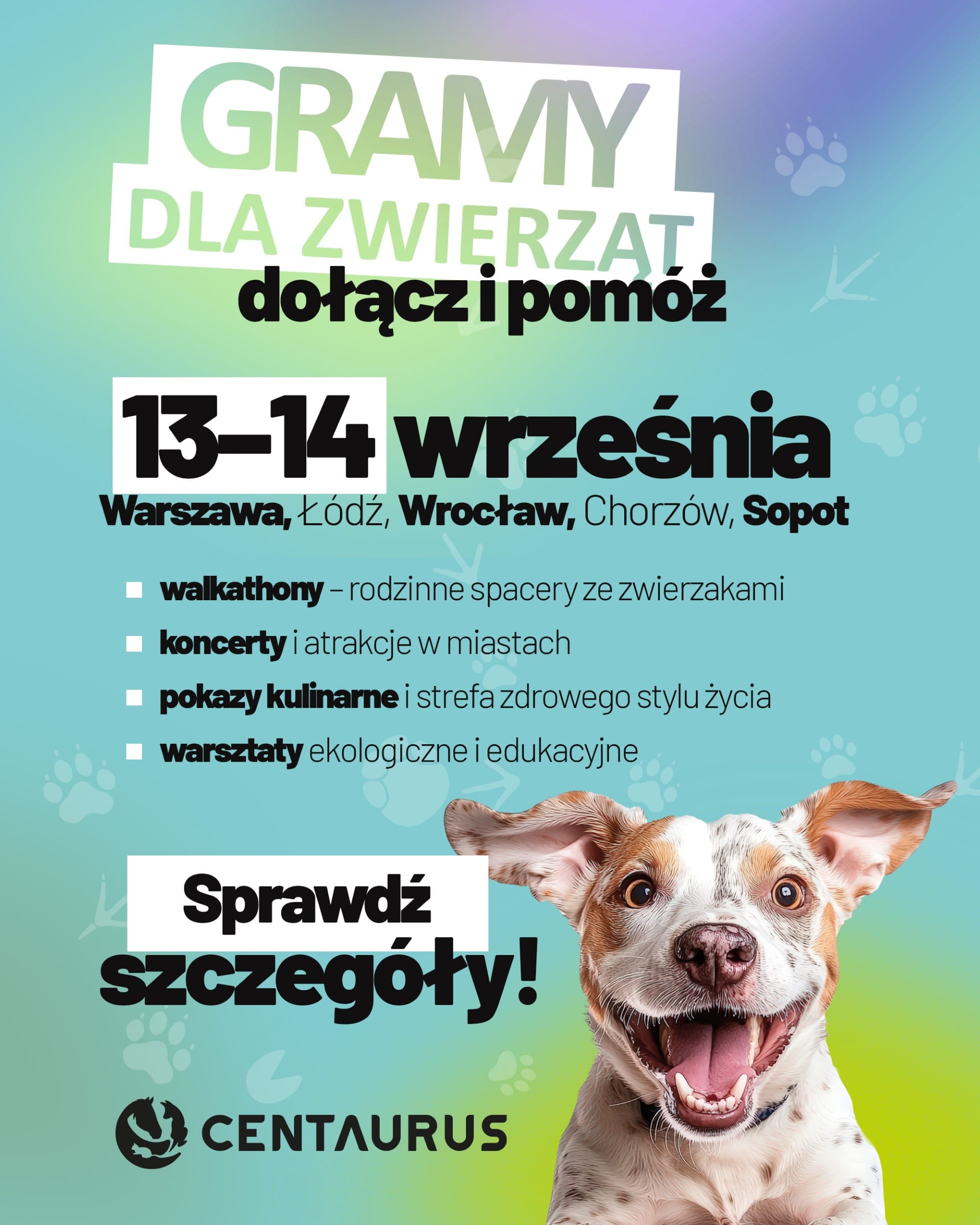 Już w weekend 13–14 września 2025 r. odbędzie się wielki finał ogólnopolskiej kampanii charytatywnej „Gramy dla Zwierząt”, organizowanej przez Fundację Centaurus – jedną z największych organizacji prozwierzęcych w Europie.