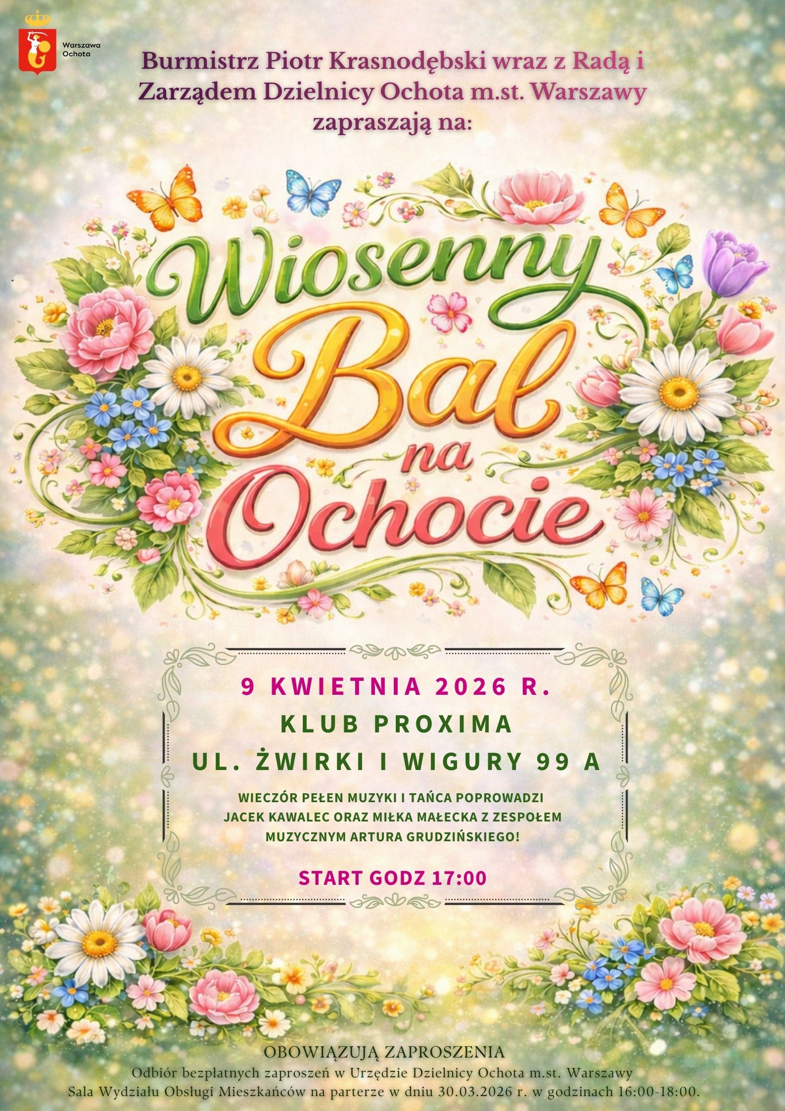 9 kwietnia 2026 roku o godzinie 17:00 mieszkańcy Warszawy będą mieli okazję wziąć udział w wyjątkowym wydarzeniu – Wiosennym Balu na Ochocie. Na wspólną zabawę zaprasza Piotr Krasnodębski, Burmistrz Dzielnicy Ochota m.st. Warszawy, wraz z Radą i Zarządem Dzielnicy.