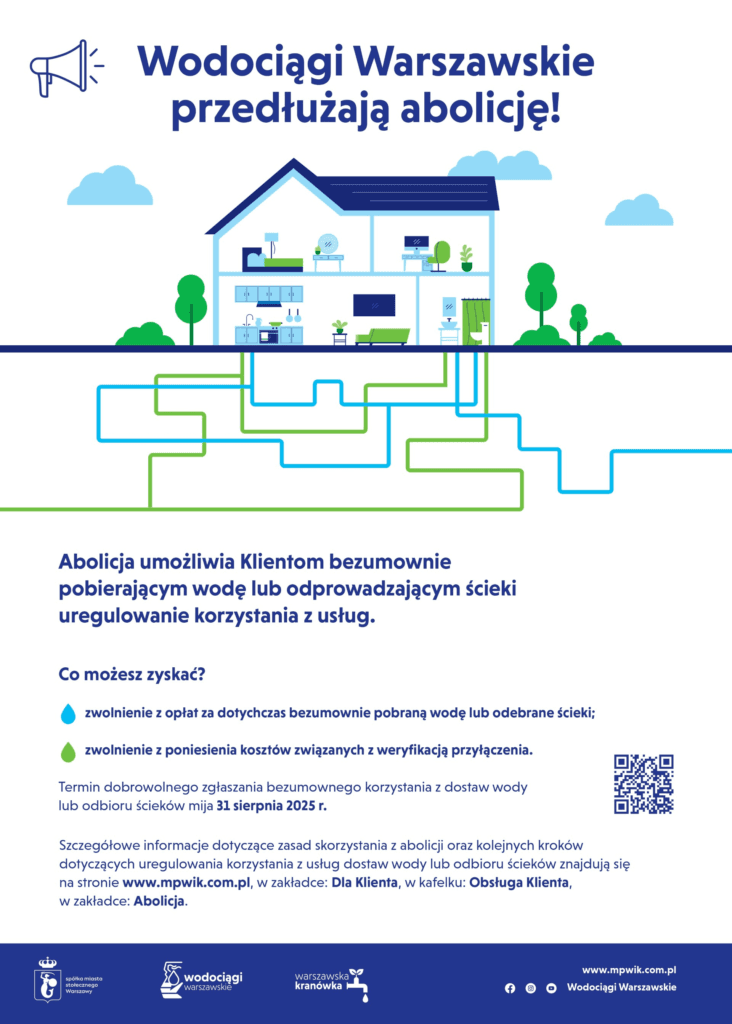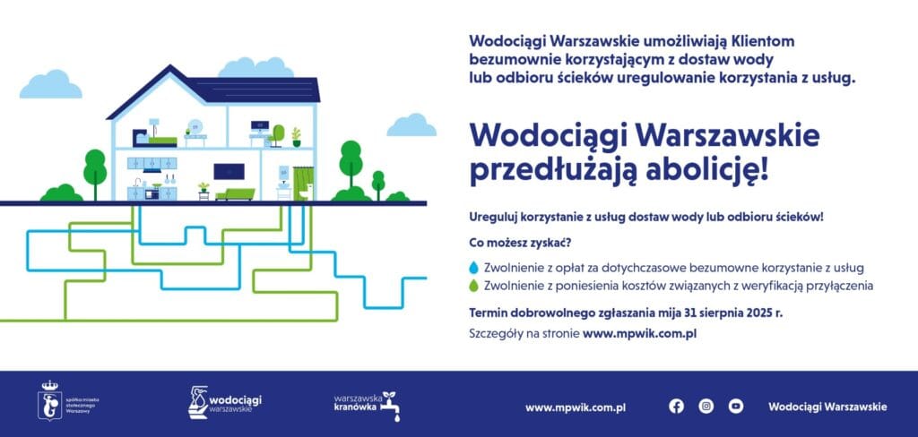 Warszawskie Wodociągi wydłużają termin zgłoszeń w ramach abolicji. Osoby, które bez umowy korzystają z miejskich usług dostawy wody lub odprowadzania ścieków, mają teraz więcej czasu, by uregulować swój status bez konsekwencji finansowych. Wyznaczono nowy, ostateczny termin.