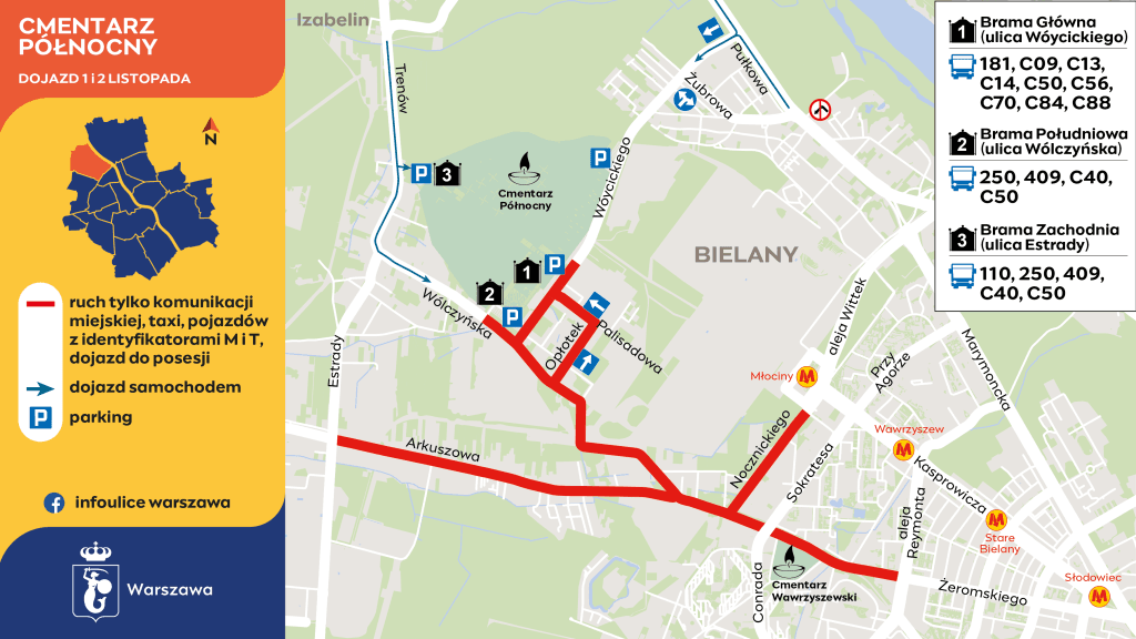 Wokół Cmentarza w Tarchominie zamknięta zostanie ulica Mehoffera od ul. Ordonówny do ul. Myśliborskiej (ruch tylko dla dojeżdżających do posesji). Wyłączona z parkowania zostanie ulica Mehoffera od ul. Ceglanej do ul. Ordonówny, oraz Majolikowa, Pomorska i Milenijna – od ul. Ćmielowskiej do ul. Mehoffera.