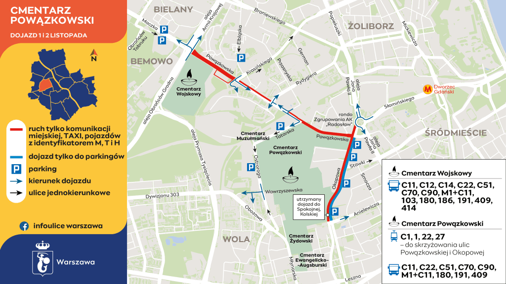 W dniu Wszystkich Świętych w rejonie warszawskich nekropolii wprowadzone zostaną ograniczenia w ruchu drogowym. Priorytet będzie miała komunikacja miejska, a część ulic zostanie przekształcona w tymczasowe parkingi dla odwiedzających cmentarze. Jak dojechać na najważniejsze nekropolie w Warszawie? Oto praktyczny poradnik ze wszystkimi zmianami na świąteczny weekend.