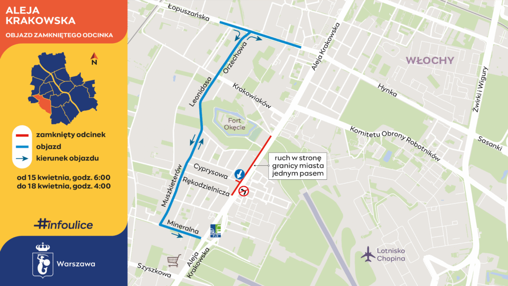 W środę 15 kwietnia rozpocznie się wymiana nawierzchni na prawym pasie Al. Krakowskiej. Prace potrwają do soboty 18 kwietnia. Wymusi to wyłączenie z ruchu dwóch pasów, a połączenie z Al. Krakowską stracą trzy ulice. Zmieni się też organizacja ruchu niektórych autobusów.