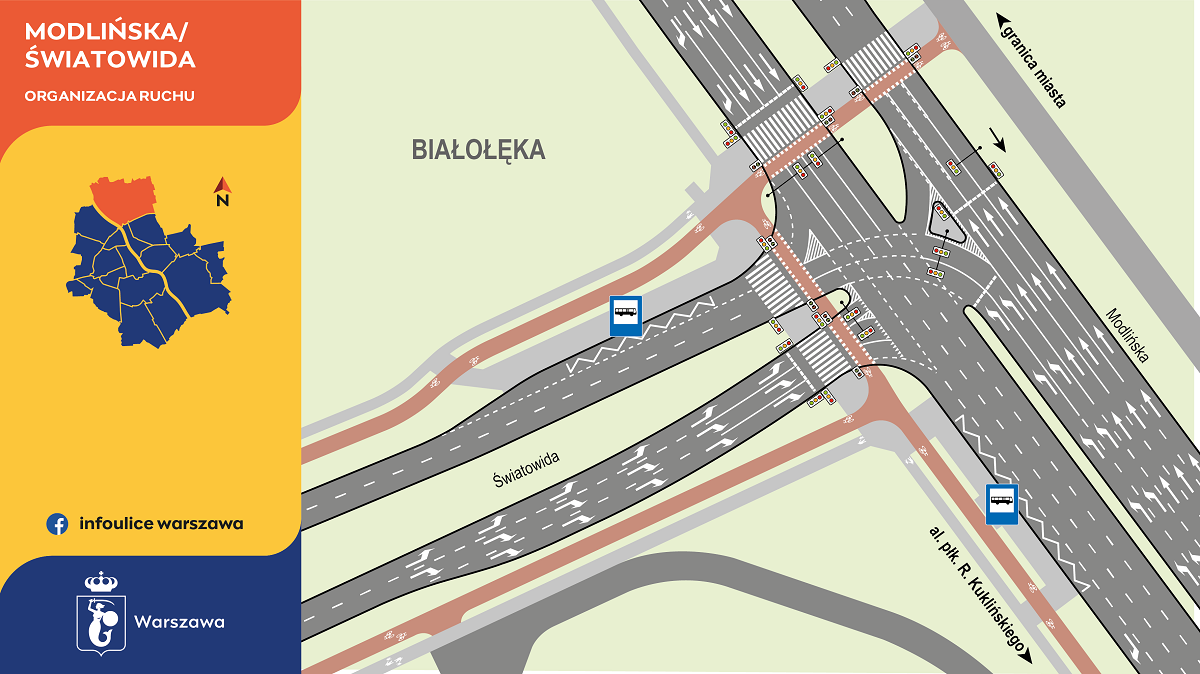 Nowa jezdnia ul. Światowida będzie miała dwa pasy ruchu – z poszerzeniem do trzech (przed nowym skrzyżowaniem). U zbiegu z Modlińską dwa z nich będą przeznaczone do skrętu w prawo (w kierunku ulicy Jagiellońskiej), a jeden do skrętu w lewo (w kierunku granicy miasta). Na jezdnię w przeciwnym kierunku złożą się dwa pasy ruchu. Z ulicy Modlińskiej, jadąc od strony Jagiellońskiej, będzie można skręcić w Światowida dwoma pasami; od północy natomiast jednym pasem. Wyznaczone zostaną nowe przejścia dla pieszych i przejazdy rowerowe – przez ulicę Światowida i przez Modlińską, po północnej stronie skrzyżowania; na skrzyżowaniu zaplanowano sygnalizację świetlną.