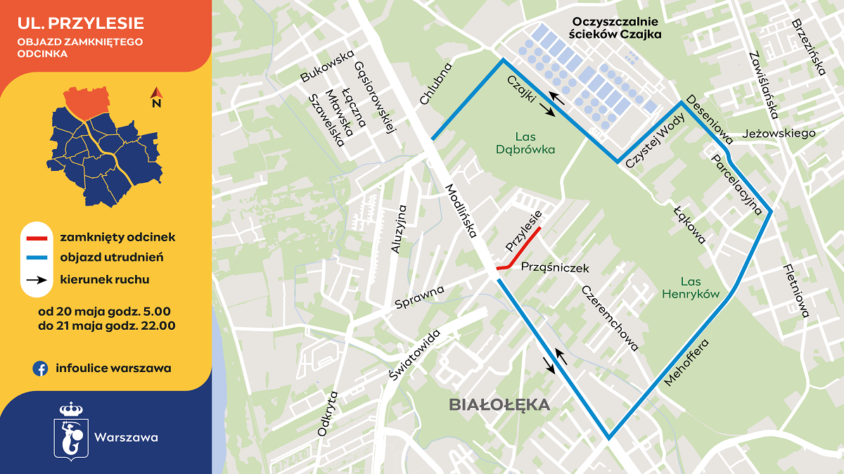 Objazd będzie prowadził ulicami Mehoffera, Parcelacyjną, Deseniową, Czystej Wody, Czajki do drogi technicznej i ulicy Modlińskiej. Trasę zmienią autobusy linii 900.