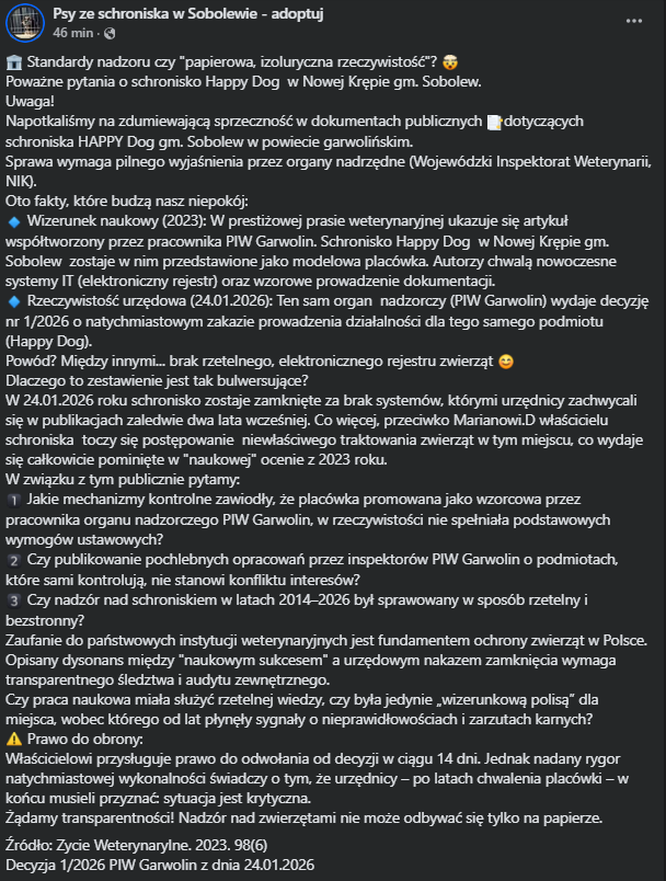 Dlaczego to zestawienie jest tak bulwersujące? W 24.01.2026 roku schronisko zostaje zamknięte za brak systemów, którymi urzędnicy zachwycali się w publikacjach zaledwie dwa lata wcześniej. Co więcej, przeciwko Marianowi.D właścicielu schroniska toczy się postępowanie niewłaściwego traktowania zwierząt w tym miejscu, co wydaje się całkowicie pominięte w „naukowej” ocenie z 2023 roku, czytamy.