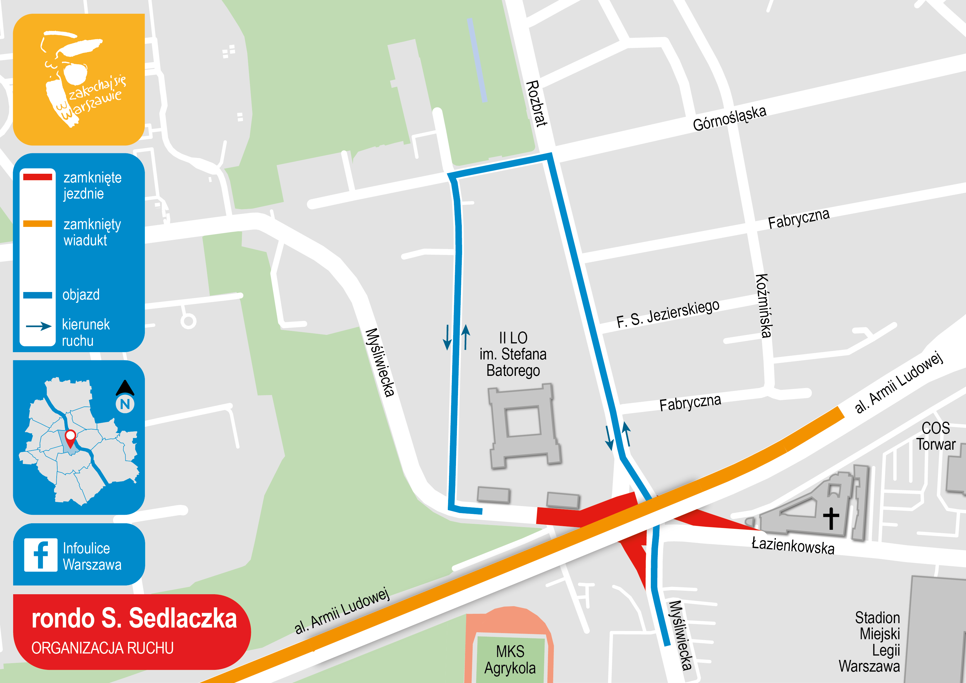 Ulica będzie kończyła się ślepo na wysokości posesji przy ul. Myśliwieckiej 6B. Ruch ulicami Myśliwiecką (od strony ul. Szwoleżerów), Rozbrat i Łazienkowską będzie odbywał się na dotychczasowych zasadach. Jedyną zmianą będzie brak możliwości skrętu w ul. Myśliwiecką w stronę ul. Górnośląskiej. Utrudnienia będzie można ominąć ulicami: J. Hoene-Wrońskiego, Górnośląską i Rozbrat.