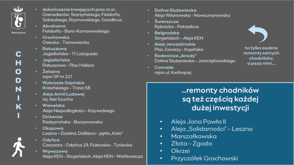 ZDM ma w planach modernizację Alei Jerozolimskich. Drogowcy wymienią asfalt na odcinku od Placu Zawiszy do ulicy Sokołowskiego „Grzymały”. Drugą dużą inwestycją będzie remont całej długości Alei Sztandarów w Rembertowie (od al. Chruściela „Montera” do ul. Czwartaków).