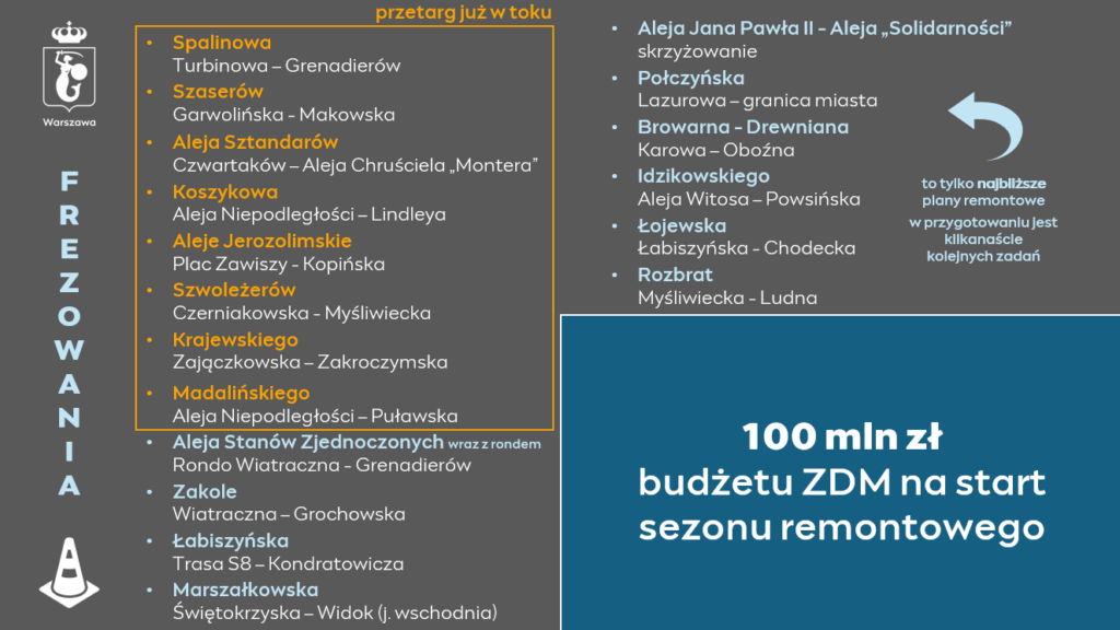 W sumie w budżecie na 2026 rok Warszawa przeznaczyła na remonty ulic okrągłe 100 mln złotych. Przetarg na pierwsze osiem lokalizacji już trwa, a prace ruszą, gdy tylko pozwolą na to warunki atmosferyczne.