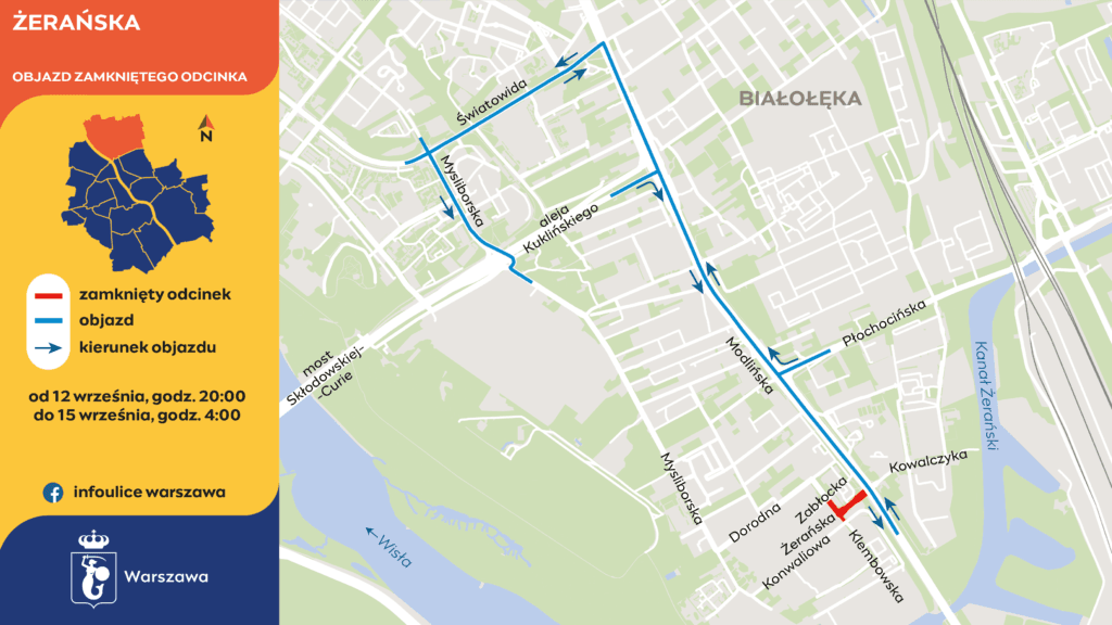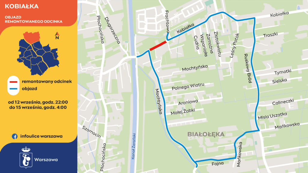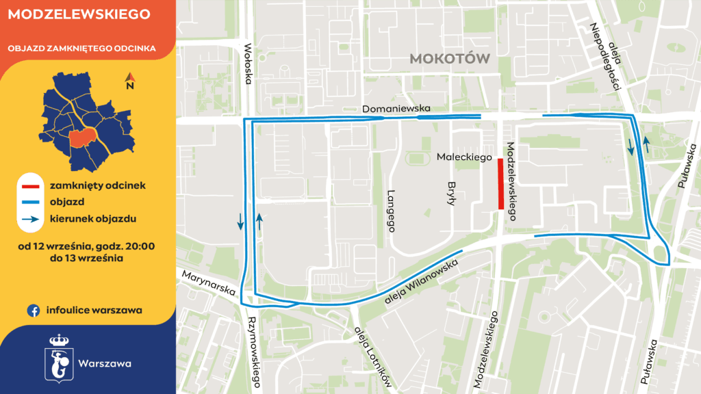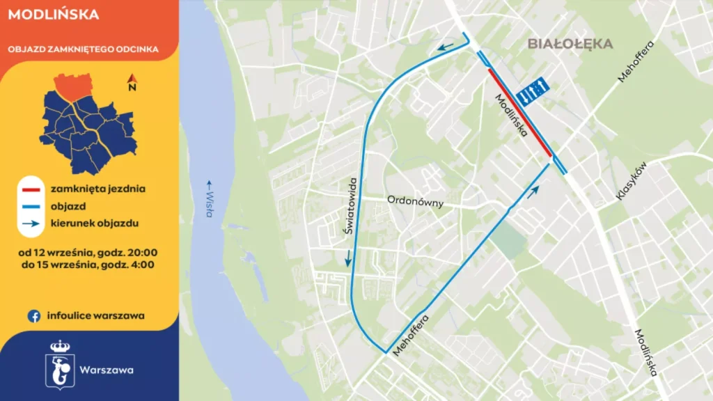 12 września około godziny 20:00 drogowcy zamkną całą nitkę ul. Modlińskiej w stronę Pragi-Północ – na odcinku od ul. Ćwiklińskiej do Mehoffera. Kierowcy zostaną skierowani na drugą jezdnię, gdzie w stronę Pragi pojadą jednym pasem. Z kolei dwa pozostałe pasy będą dostępne dla ruchu w kierunku Legionowa.