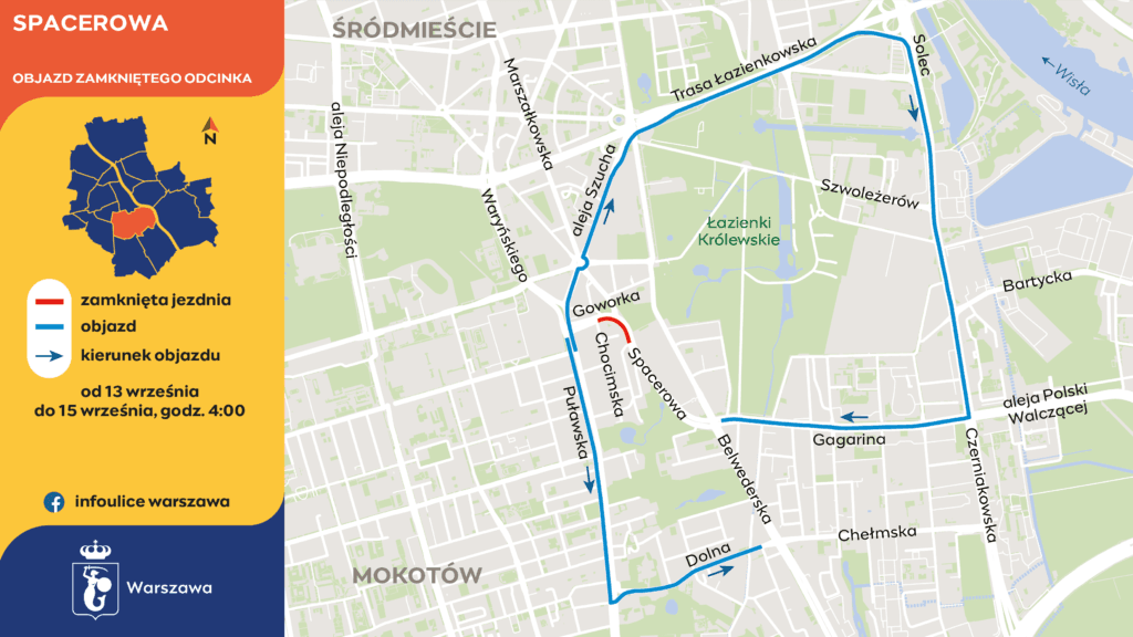 Na Mokotowie również nie zabraknie utrudnień. Od nocy z piątku na sobotę ul. Spacerowa będzie zamknięta na odcinku od ul. Chocimskiej do Słonecznej. Objazdy zostaną poprowadzone m.in. przez Dolną, Puławską i Trasę Łazienkowską. Do poniedziałku zmienionymi trasami pojadą autobusy linii 167, 168, N31 i N81.
