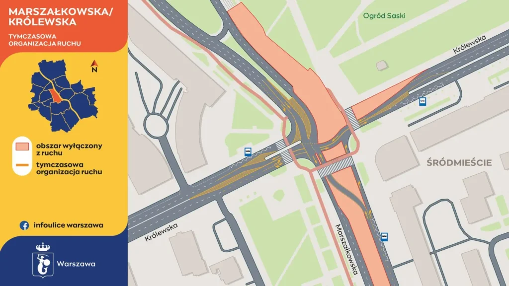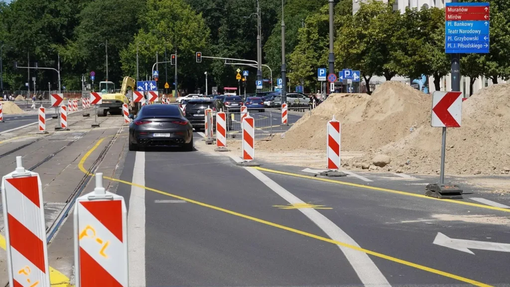 Zamknięte zostaną fragmenty jezdni Marszałkowskiej w stronę placu Bankowego oraz Królewskiej w kierunku Grzybowskiej. W stronę placu Bankowego kierowcy pojadą jednym pasem przez torowisko, a następnie wrócą na właściwą jezdnię przy przystanku tramwajowym. Od placu Piłsudskiego w Królewską będzie można przejechać tylko prosto w kierunku placu Grzybowskiego i alei Jana Pawła II.